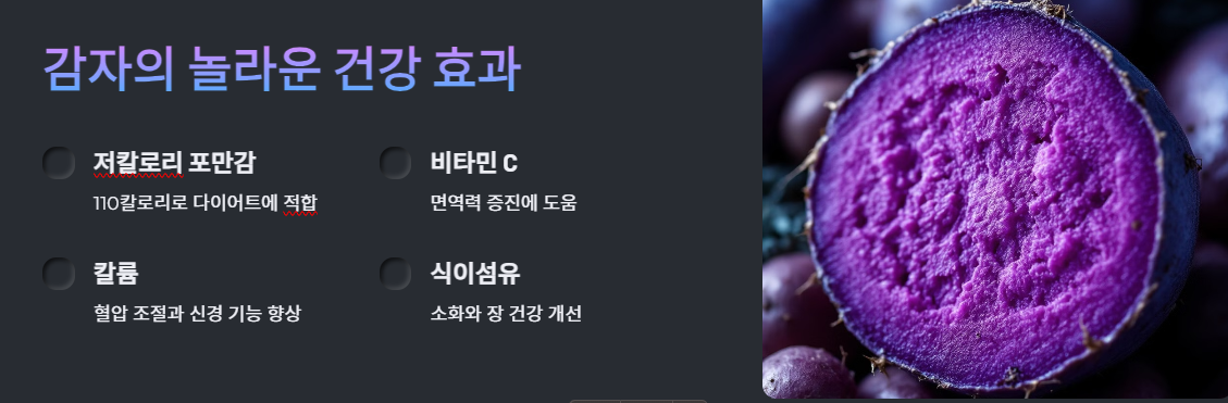 제가 생각했을 때, 감자는 단순히 맛있는 음식이 아니라 건강에 큰 도움이 되는 식품이라고 느껴져요. 감자는 속이 더부룩하거나 위장이 예민할 때 소화를 도와주는 효과가 있어서 특히 부담스럽지 않은 음식을 찾을 때 정말 좋은 선택이 될 수 있어요. 삶거나 구워 먹으면 기름기를 줄이면서도 포만감을 주기 때문에 건강식으로도 활용 가능해요.