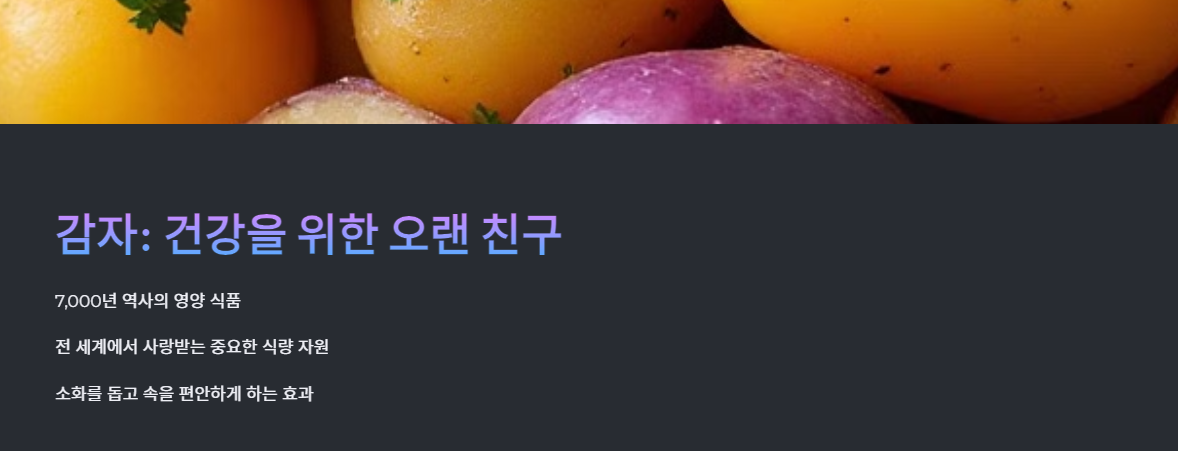 감자는 인류의 오랜 친구 같은 작물이에요. 약 7,000년 전 안데스 산맥 지역에서 재배가 시작되었고, 현재는 전 세계에서 중요한 식량 자원으로 사랑받고 있어요. 감자는 그 자체로도 훌륭한 영양소를 포함하고 있을 뿐만 아니라, 소화를 돕고 속을 편안하게 해주는 효과도 가지고 있어요.