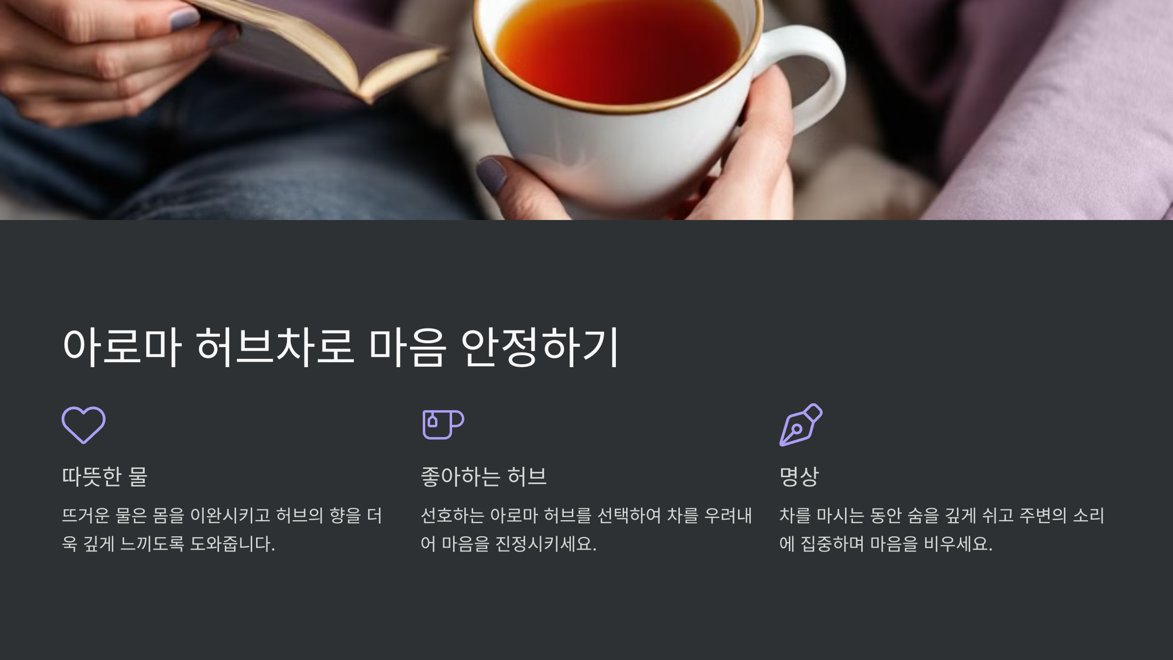 휴식 시간마다 허브차를 마시는 작은 습관이 마음과 몸을 더욱 건강하게 만들어 줄 거예요. 차를 마시며 자신만의 평화로운 시간을 만들어보세요.