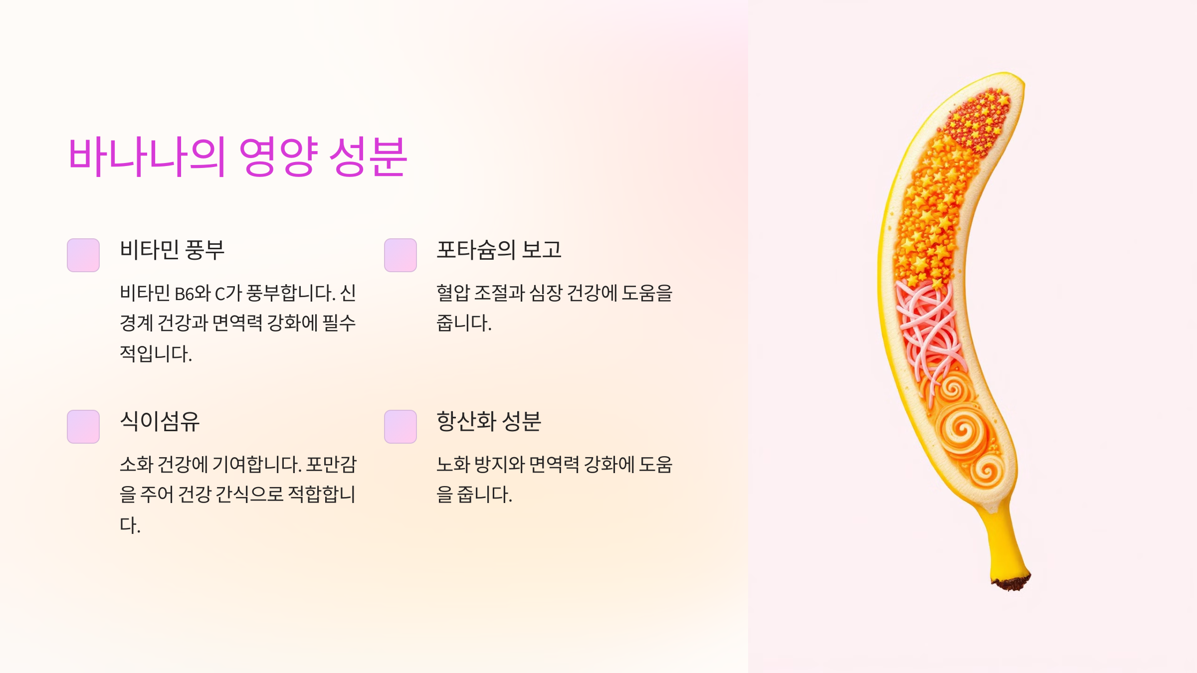 포타슘은 바나나의 대표적인 성분으로, 혈압 조절과 심장 건강에 도움을 줍니다.