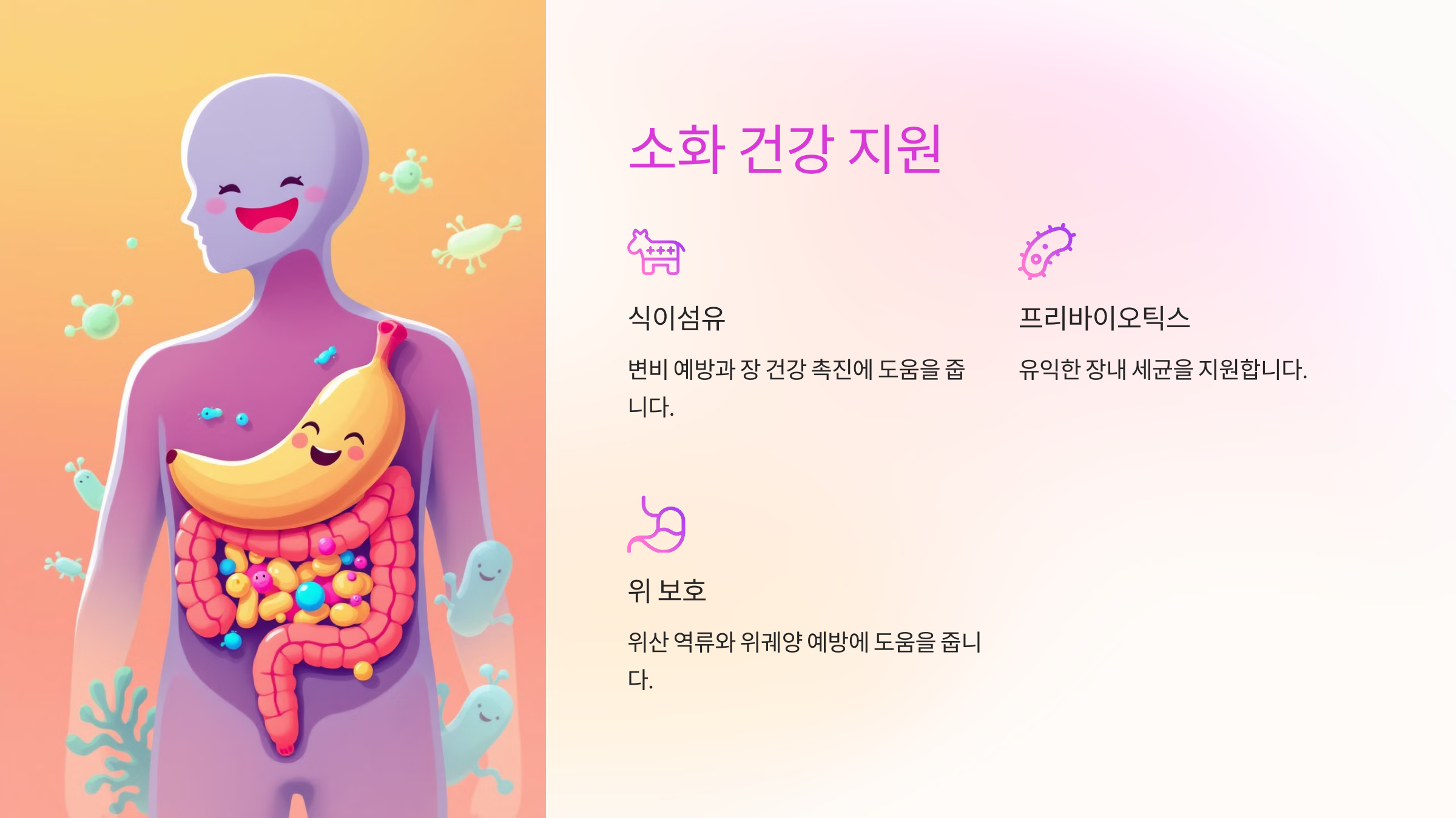 소화 흡수율을 높이고 전반적인 소화 기능을 개선합니다.