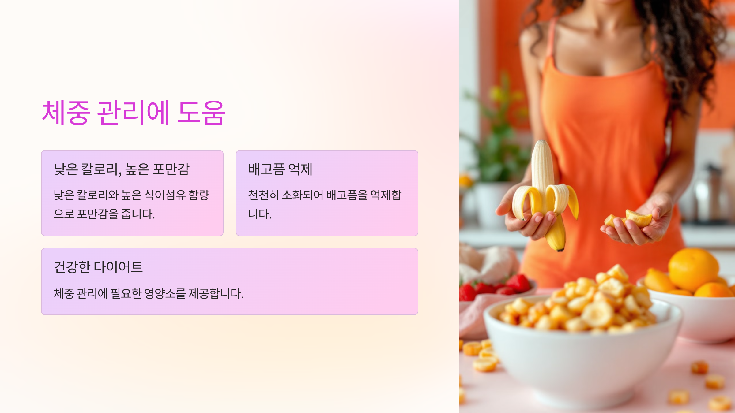 낮은 칼로리와 높은 식이섬유 함량으로 포만감을 줍니다.