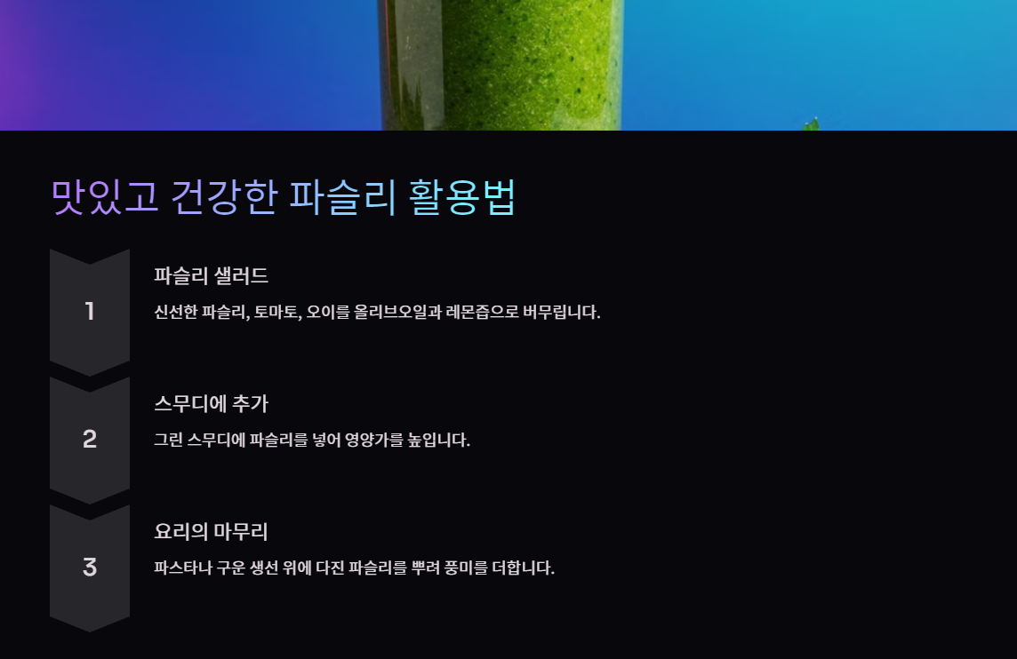 파슬리 수프나 파슬리를 활용한 스무디도 추천합니다.