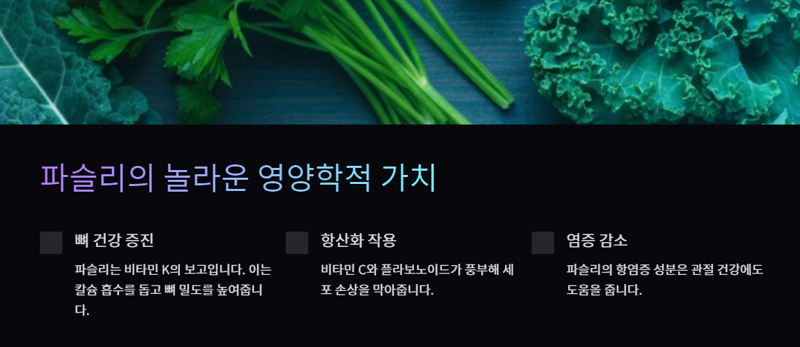 파슬리는 칼슘과 함께 섭취하면 그 흡수율을 높이는 작용을 합니다. 칼슘이 풍부한 재료와 조합하면 뼈 건강에 더욱 긍정적인 영향을 미칩니다.