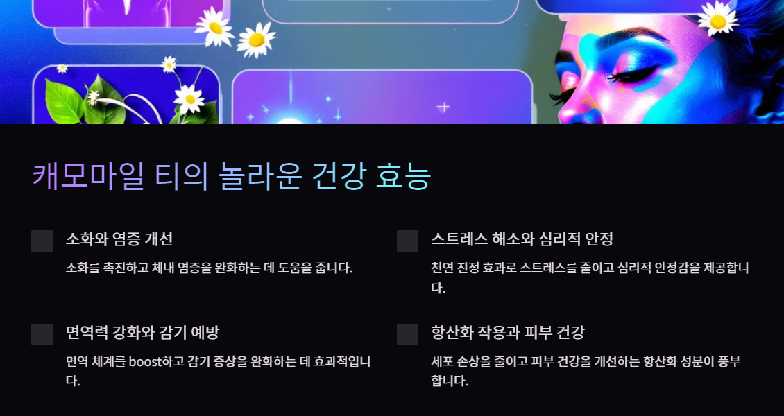 이처럼 캐모마일 티는 다양한 허브와의 조합으로 건강을 더욱 풍부하게 관리할 수 있습니다.
