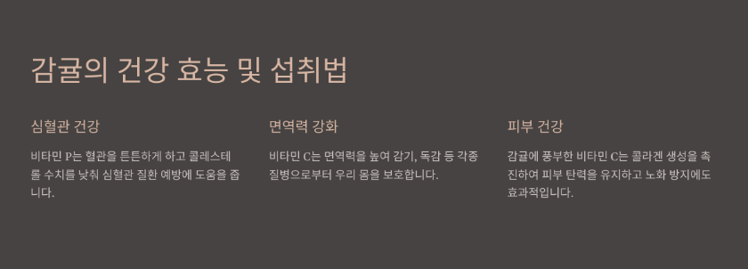 겨울철은 면역력이 약해지기 쉬운 계절이에요. 감귤은 비타민 C를 다량 함유하고 있어 겨울철 감기와 같은 질환 예방에 탁월한 효과를 보여줘요. 면역력을 높이는 감귤은 가족 모두가 즐길 수 있는 건강 과일이에요.