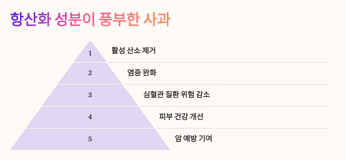 사과는 항산화 성분이 풍부해 체내 활성 산소를 제거하는 데 도움을 줍니다.