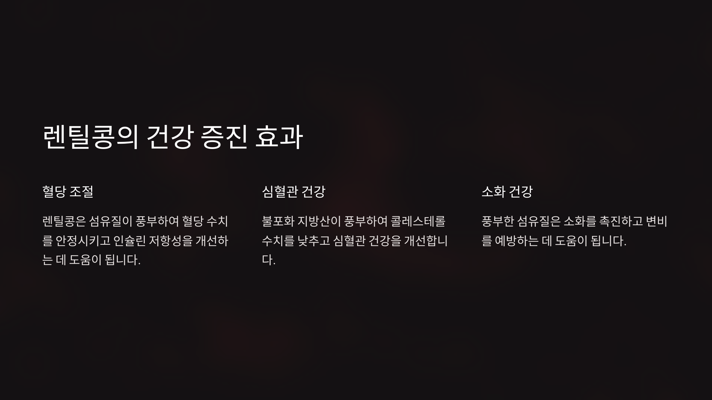 둘째, 렌틸콩에 함유된 풍부한 식이섬유는 소화 시스템을 개선해 줘요. 중년이 되면서 소화 기능이 약화되기 쉬운데, 렌틸콩은 규칙적인 배변을 돕고 장 건강을 유지할 수 있게 도와준답니다. 게다가, 혈당 조절에도 효과가 있어서 당뇨 관리에도 긍정적인 영향을 미쳐요.