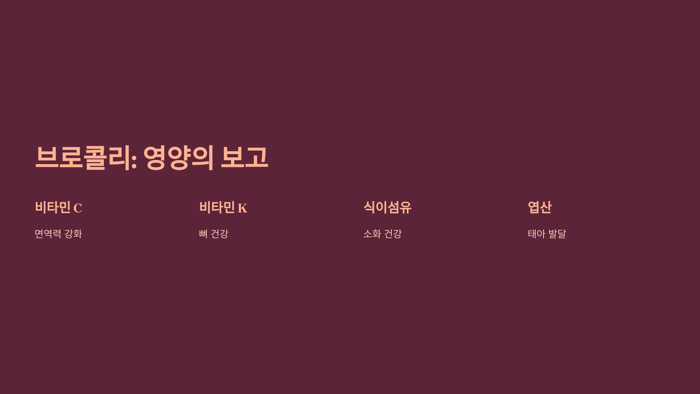 브로콜리는 다양한 비타민과 미네랄이 풍부한 채소예요. 특히 비타민 C, 비타민 K, 엽산, 식이섬유, 항산화 성분이 풍부하게 함유되어 있어요.