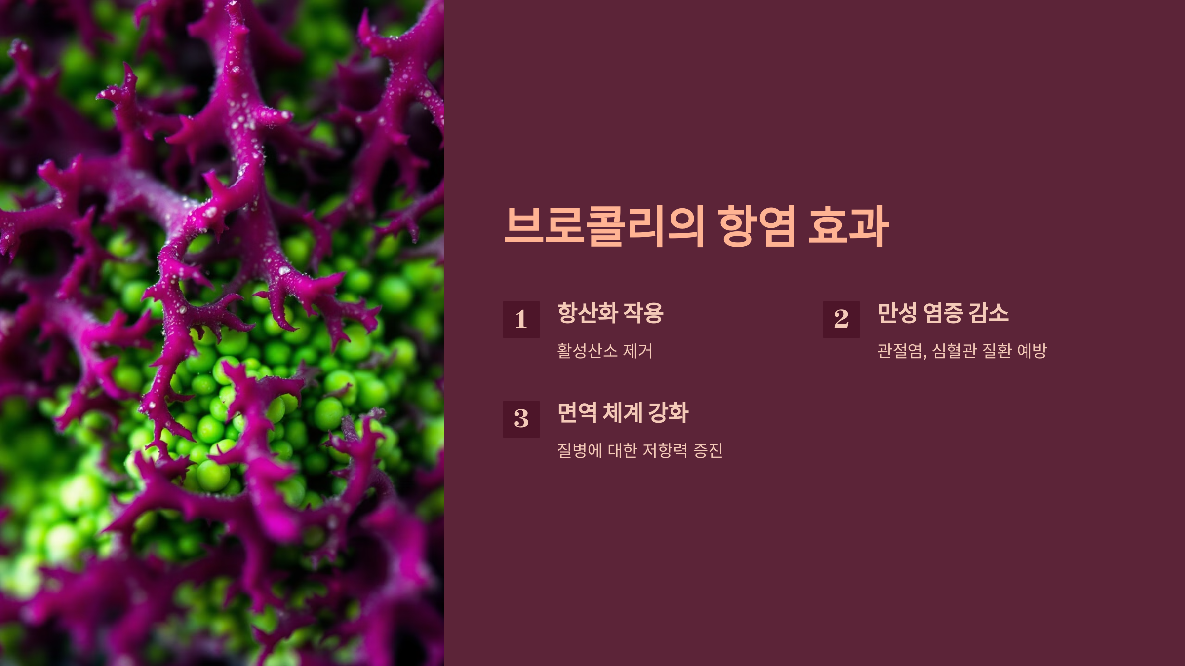 이렇게 영양이 가득한 브로콜리는 특히 항염 효과가 뛰어나요. 꾸준히 섭취하면 만성 염증을 줄이고, 면역력을 강화하는 데 도움이 돼요. 다음 섹션에서는 브로콜리의 항염 효과에 대해 좀 더 자세히 알아볼게요! 🥦