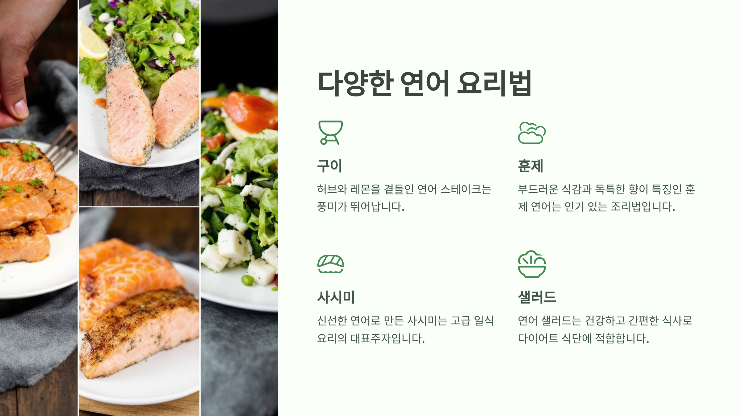 연어는 다이어트 식단에서 매우 유용한 재료로, 단백질 함량이 높아 근육 형성에 도움을 줍니다.