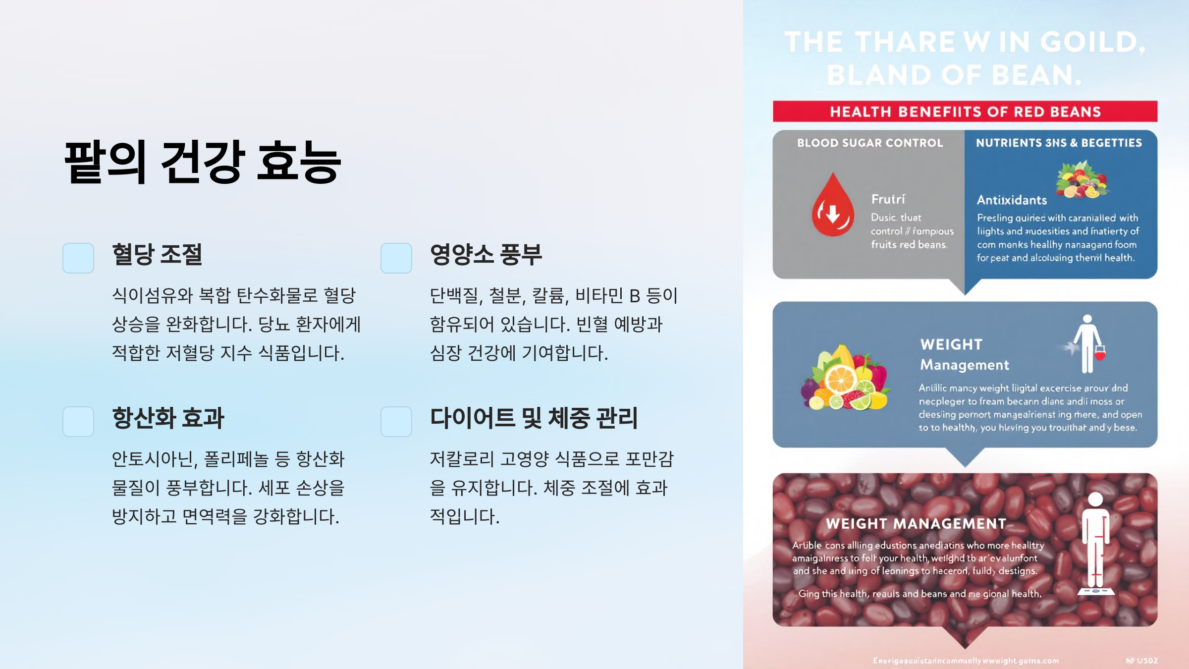 팥은 저칼로리 고영양 식품으로 다이어트에 효과적입니다.