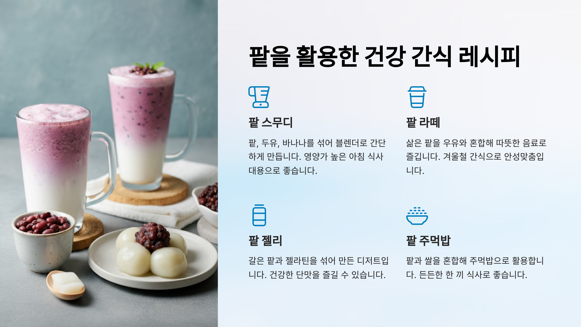 팥을 활용하여 다양한 디저트를 만들 수 있습니다. 예를 들어 팥 머핀이나 팥 케이크가 인기 있습니다.