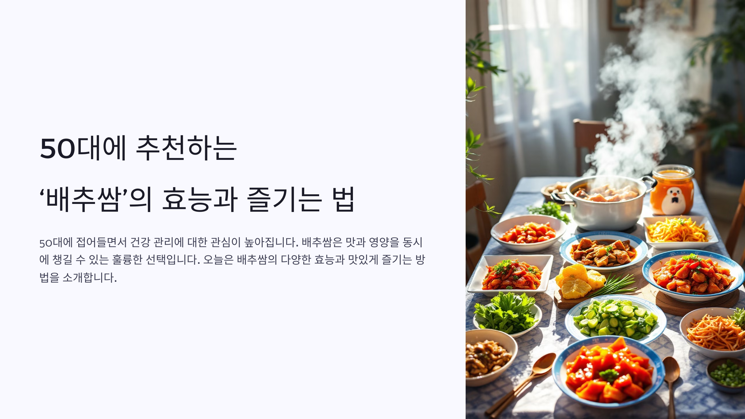 50대 이후에는 과식보다는 균형 잡힌 식단이 중요한데, 배추쌈은 부담 없이 먹을 수 있어 건강한 식생활을 유지하는 데 매우 유용한 음식입니다.