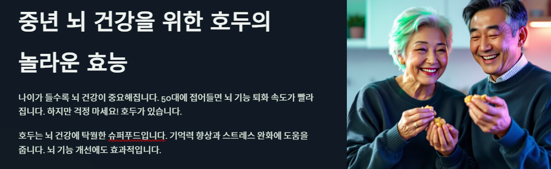 50대 이후 뇌 건강은 삶의 질을 결정짓는 중요한 요소 중 하나입니다. 호두는 뇌 건강뿐 아니라 전반적인 신체 건강에도 도움을 주는 강력한 식품입니다. 꾸준한 섭취와 균형 잡힌 식단을 통해 건강한 뇌와 몸을 유지하세요.