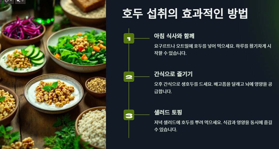 • 생호두 섭취: 생으로 먹는 것이 가장 간편하며 영양소 흡수율도 높습니다.