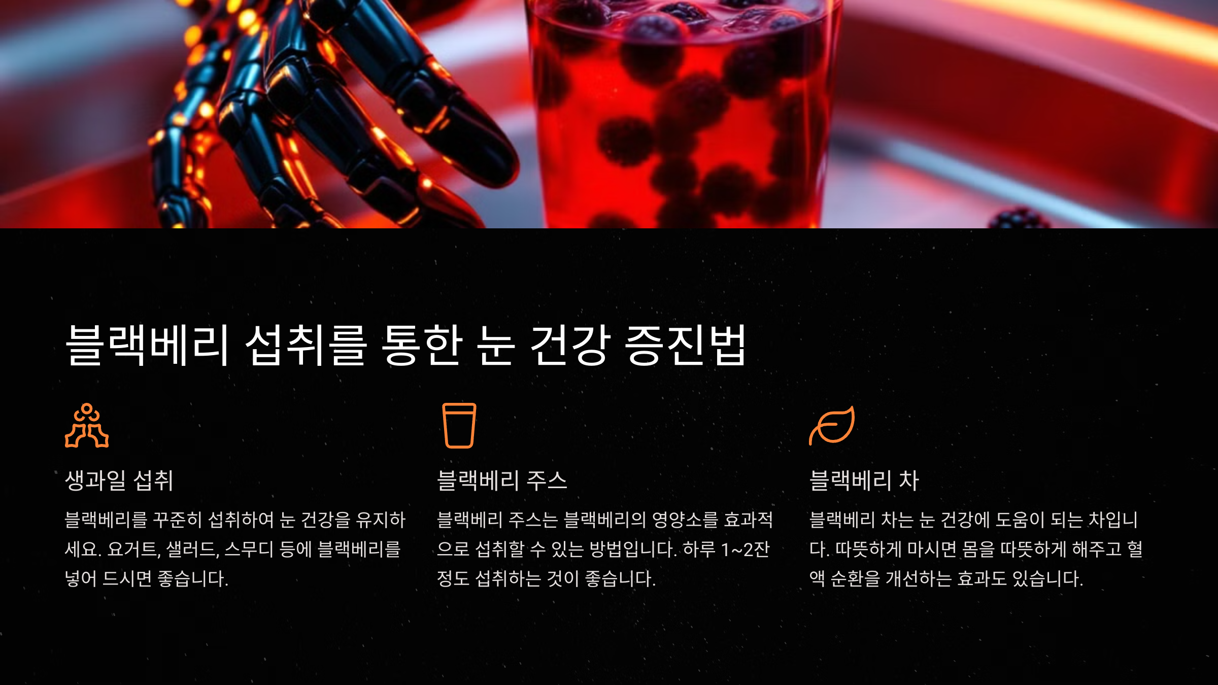 블랙베리는 눈 건강과 젊음을 유지하는 데 효과적인 과일로 알려져 있어요. 특히 안토시아닌, 비타민 C, 비타민 E와 같은 강력한 항산화 성분을 포함하고 있어 시력 보호와 노화 방지에 큰 도움을 준답니다. 이러한 특성 덕분에 블랙베리는 50대 이상 분들에게 사랑받는 과일로 자리 잡고 있어요.